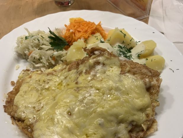 Karbonāde ar sieru un vārītiem, ceptiem kartupeļiem, silto mērci un salātiem. Ņemu veselu porciju. Likās ka vārītie, cepti kartupeļi varēja būt vairāk. Bet kopumā garšīgi, paēst var.