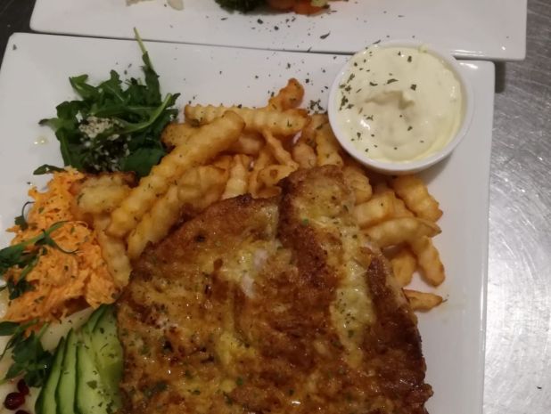 Ēdienkartē bija 2 veidu cūkgaļas karbonādes - franču gaumē (7 eiro), kā arī cūkgaļas karbonāde ar sieru (6 eiro). Vistas karbonādes nebija, bija tikai fistas fileja siera kažociņā, kas nav īsti pieskaitāma pie karbonāžu kategorijas. Ja karbonādi grib pamērcēt kādā mērces vannītē, tad jārēķinās, ka par mērcēm jāmaksā atsevišķi (kečups un majonēze maksā 0,50 centus, bet ķiploku mērce - 0,90 centus). Piedevas (salāti un kartupeļi) iekļauti cenā. Izvēle krita par labu klasikai - cūkgaļas karbonādei ar sieru, frī kartupeļiem un ķiploku mērcei (6,90 eiro). Patīkami apzināties, ka karbonāde nav pastāvējusi, bet tiek gatavota uzreiz. Varēja dzirdēt tik ļoti ausīm tīkamo karbonādes dauzīšanu, kas uzreiz mutē liek sariesties siekalām. Karbonādi siera mētelītī atnesa salīdzinoši ātri, turklāt - tā bija liela un karsti kūpoša, ka pat nedaudz nācās pagaidīt. Cena bija atbilstoša porcijas lielumam.