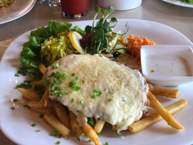 Varēja dzirdēt kā skan "Karbonādes dziesmiņa" no virtuves, kas liecināja, ka būs labi. Atnāca teiksim tā, garšīga, ar sierinu apsegta galina, ar karpelīšiem un salātiņiem. Vienkārši un garšīgi. Cena ar piedevām 3:80